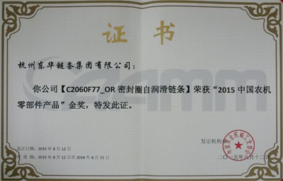 會上,與會人員主要圍繞會議主題進行技術、市場、創(chuàng)新、發(fā)展等廣泛交流。會議期間,評比并頒發(fā)了2015中國農機零部件46項金獎產品和25項創(chuàng)新獎產品。東華申報的C2060F77_OR和C2062H_ORSDF1密封圈鏈條經久保田、福田雷沃等知名整機企業(yè)的推薦,專家委員會最終評審決定,對 東華申報的這兩款密封圈鏈條分別授予金獎和創(chuàng)新獎。這個獎項是目前農機鏈條企業(yè)的最高榮譽,體現了東華農機鏈條處于國內同行領先水平,得到廣大農業(yè)主機單位的贊譽和認可。東華生產的農機鏈條也暢銷國際市場,與CLASS、紐荷蘭等世界500強企業(yè)配套。