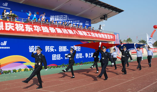 開幕式上,隨著高亢激昂的運動員進行曲響起,國旗隊、廠旗隊、舞蹈隊、東華黨群服務(wù)驛站代表隊、各分工會代表隊等共19支方隊有序入場。各代表隊員工精神飽滿,口號響亮,步伐整齊,展示出東華員工朝氣蓬勃的精神風貌。