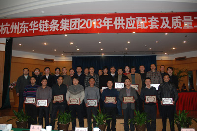 最后,財務(wù)總監(jiān)趙鵬飛宣布了2012年優(yōu)秀供應(yīng)商名單,與會高層向優(yōu)秀供應(yīng)商代表頒發(fā)證書并合影留念。優(yōu)秀供應(yīng)商杭州萬盛精拔拉絲有限公司副總經(jīng)理王濱之和供應(yīng)商無錫市福特物貿(mào)有限公司總經(jīng)理吳福清分別發(fā)言。