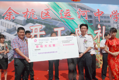 7月3日,烈日炎炎,在運(yùn)河中學(xué)舉行的開工典禮上,東華集團(tuán)董事長宣碧華熱心參與余杭區(qū)運(yùn)河鎮(zhèn)組織的“捐資助?!すΦ虑铩贝壬凭栀?zèng)活動(dòng),向運(yùn)河中學(xué)建校捐款100萬元,為“運(yùn)河中學(xué)”建設(shè)項(xiàng)目添磚加瓦,充分體現(xiàn)了東華集團(tuán)關(guān)心、支持教育事業(yè)的拳拳愛心。