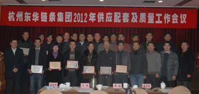 會議由副總經(jīng)理張寶康主持,張副總就2011年主要經(jīng)濟指標完成情況和2012年經(jīng)濟目標進行了簡要講話;總工程師葉斌就東華新品種開發(fā)取得的成果及發(fā)展目標、技術工作方面作了講話;副總經(jīng)理袁立華就東華2011年完成的經(jīng)濟指標,供貨質(zhì)量情況及存在的差距、外協(xié)件的質(zhì)量及體系管理方面進行了講話,并公布了2012年主要工作計劃;副總經(jīng)理廖杭州就2011年輸送鏈事業(yè)部的生產(chǎn)經(jīng)營情況進行了回顧,同時代表各事業(yè)部就2012年事業(yè)部對采購和供應商的主要要求即采購目標和供應鏈建設提出要求;財務總監(jiān)趙鵬飛宣布2011年優(yōu)秀供應商名單,公司高層向優(yōu)秀供應商代表頒發(fā)證書并合影。