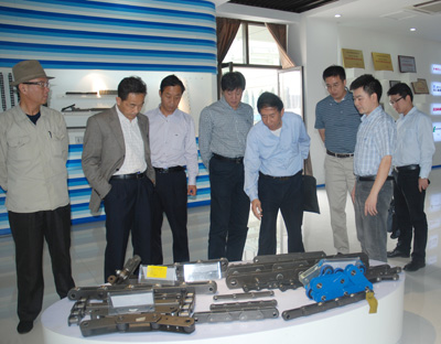 9月23日,浙江省科技咨詢中心副主任陳偉、杭州市科技咨詢中心、杭州市院士專家服務中心主任吳挺等省市區(qū)科學技術協(xié)會領導陪同寧夏回族自治區(qū)科學技術協(xié)會副主席王冰等領導到東華集團就院士工作建設情況及取得的成效進行調研。圖為副總經(jīng)理袁立華、技術中心顧問陳金賢陪同陳主任一行參觀樣品。