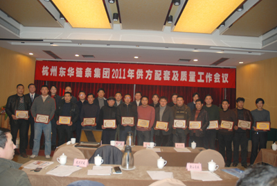 隨后,張寶康副總宣布2010年“優(yōu)秀供方”與“特別貢獻(xiàn)獎(jiǎng)”供方名單,與會(huì)領(lǐng)導(dǎo)向獲獎(jiǎng)供應(yīng)商頒發(fā)了證書并合影留念.杭州萬(wàn)盛精拉絲有限公司崔總作為“優(yōu)秀供方”代表與 杭州三志緊固件軸承有限公司屠董作為“特別貢獻(xiàn)獎(jiǎng)”代表上臺(tái)作了發(fā)言。
