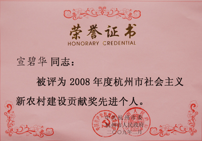 日前,東華鏈條集團(tuán)董事長宣碧華被中共杭州市委、杭州市人民政府授予 “2008年度杭州市社會主義新農(nóng)村建設(shè)貢獻(xiàn)獎先進(jìn)個人”榮譽(yù)稱號。