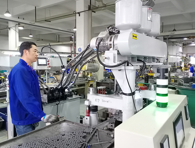 東華積極應(yīng)對(duì)訂單爆發(fā)式增長(zhǎng),為滿足客戶交貨需求,今年一季度,公司技改設(shè)備投入已經(jīng)超過了去年全年,達(dá)到了2000多萬元。如農(nóng)機(jī)鏈?zhǔn)聵I(yè)部不斷加大技術(shù)革新,對(duì)ZGS外附板、S52外附板、A55外附板等落料壓彎一體化模具開發(fā)、投入100HHA成條機(jī)裝配設(shè)備代替人工裝配、組建CA、ZGS和A960系列裝配流水線代替原來的人工榔頭裝配,大大提升了生產(chǎn)效率,以滿足客戶的交貨需求。