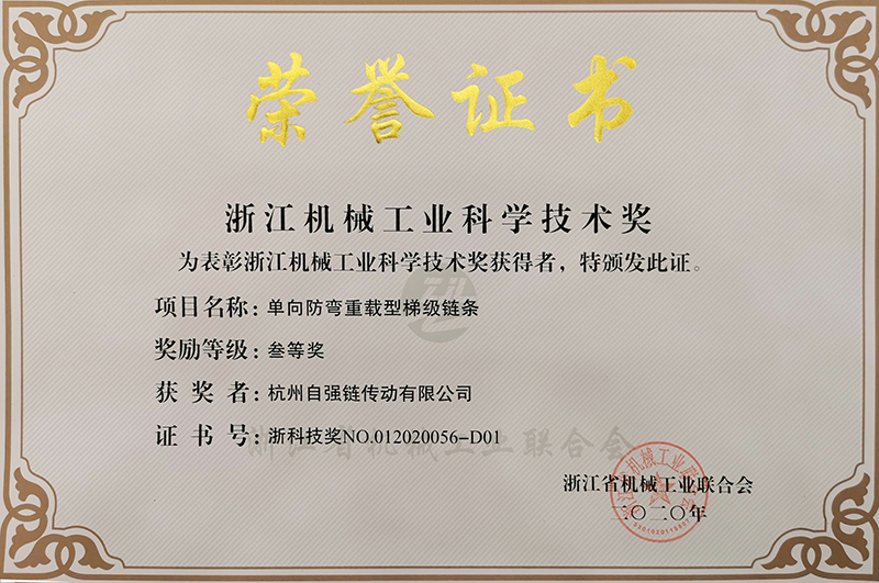 4月29日,浙江省機(jī)械工業(yè)聯(lián)合會(huì)召開(kāi)會(huì)員大會(huì),會(huì)上表彰了2020年度浙江機(jī)械工業(yè)科學(xué)技術(shù)獎(jiǎng)。集團(tuán)下屬子公司杭州自強(qiáng)鏈傳動(dòng)公司的高端產(chǎn)品“單向防彎重載型梯級(jí)鏈條”榮獲三等獎(jiǎng)。這是東華集團(tuán)產(chǎn)品創(chuàng)新項(xiàng)目連續(xù)九年榮獲浙江機(jī)械科技獎(jiǎng),也是2020年度全省機(jī)械工業(yè)科技創(chuàng)新成果獎(jiǎng)項(xiàng)中唯一的鏈傳動(dòng)企業(yè)的高端產(chǎn)品獲獎(jiǎng)。
