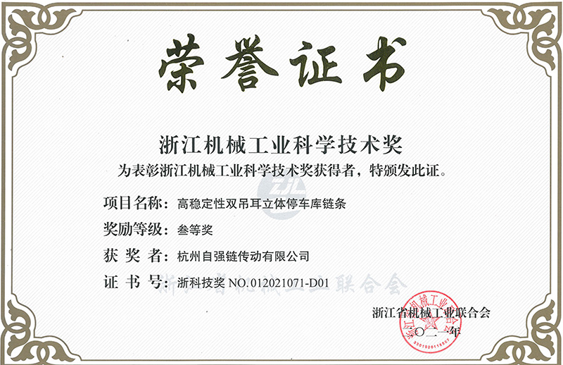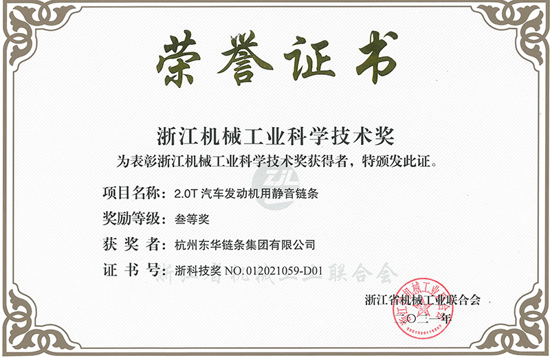 6月30日,浙江省機(jī)械工業(yè)聯(lián)合會(huì)召開會(huì)員大會(huì)。會(huì)上表彰2021年度浙江機(jī)械工業(yè)科學(xué)技術(shù)獎(jiǎng),全省機(jī)械領(lǐng)域共有72項(xiàng)科技創(chuàng)新項(xiàng)目獲獎(jiǎng)。東華 “2.0T汽車發(fā)動(dòng)機(jī)用靜音鏈條”和“高穩(wěn)定性雙吊耳立體停車庫鏈條”均獲三等獎(jiǎng),這是東華產(chǎn)品創(chuàng)新項(xiàng)目連續(xù)十年榮獲浙江機(jī)械工業(yè)科技獎(jiǎng),也是2021年度全省機(jī)械行業(yè)科技創(chuàng)新成果獎(jiǎng)中唯一鏈傳動(dòng)企業(yè)的高端產(chǎn)品獲獎(jiǎng)。