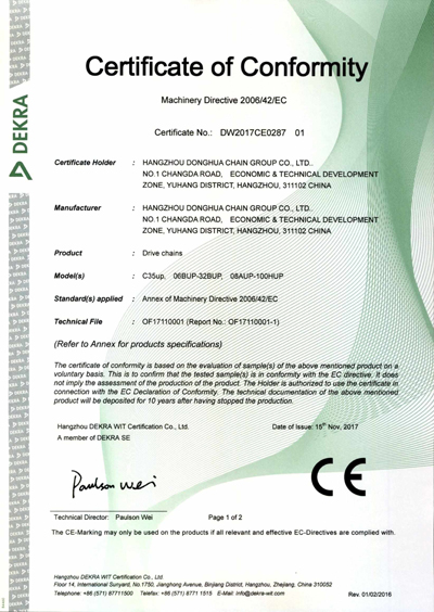 日前,集團(tuán)公司UP系列標(biāo)準(zhǔn)滾子鏈產(chǎn)品順利通過德國機(jī)動車監(jiān)督協(xié)會(Deutscher Kraftfahrzeug überwachungsverein,簡稱為DEKRA)CE認(rèn)證證書,此認(rèn)證的順利通過標(biāo)志著東華升級版標(biāo)準(zhǔn)滾子鏈拿到打開并進(jìn)入歐洲市場的護(hù)照。