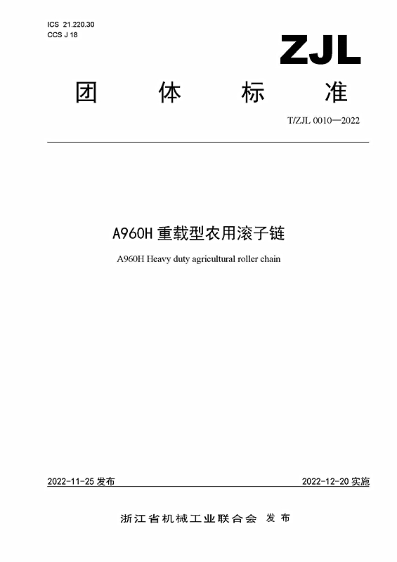 近日,浙江省機械工業(yè)聯(lián)合會批準、發(fā)布團體標準T/ZJL 0010—2022《A960H重載型農用滾子鏈》(以下簡稱《A960H鏈條》),自12月20日起實施。這項浙機聯(lián)團體標準由東華牽頭負責制定,東風農機集團等4家單位參加起草。《A960H鏈條》標準規(guī)定了適用于在各類農作物作業(yè)機械上使用的A960H重載型農用滾子鏈的主要參數(shù)和尺寸、技術要求、試驗方法、檢驗規(guī)則等要求。