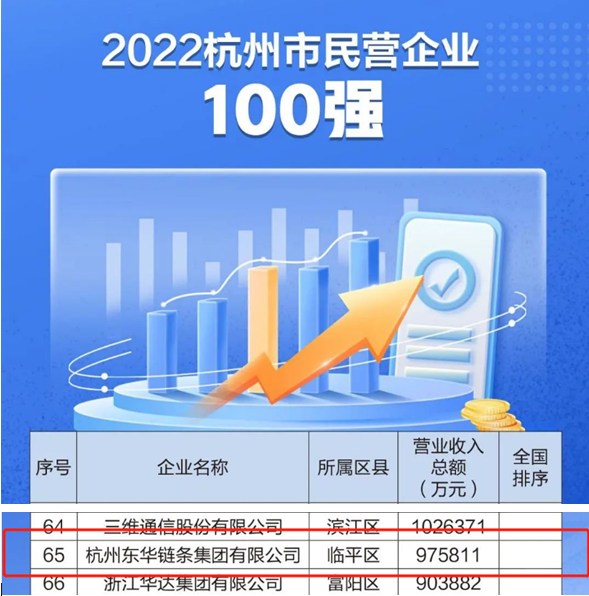 東華鏈條集團(tuán)分別榮登“2022杭州市民營企業(yè)100強(qiáng)”第65位;“ 2022杭州市民營企業(yè)制造業(yè)50強(qiáng)”第34位;“2022杭州市民營企業(yè)就業(yè)50強(qiáng)”第43位;“2022杭州市民營企業(yè)研發(fā)投入50強(qiáng)”第46位。其中,“2022杭州市民營企業(yè)100強(qiáng)”入圍門檻為33.68億元,有41家企業(yè)入選“2022中國民營企業(yè)500強(qiáng)”。