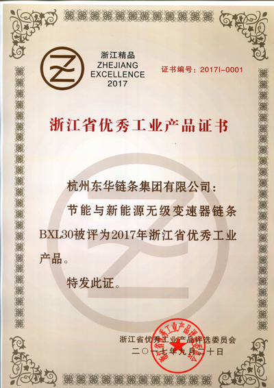 東華鏈條集團“BXL30節(jié)能與新能源無級變速器鏈條”被授予“2017年浙江省優(yōu)秀工業(yè)產(chǎn)品”稱號