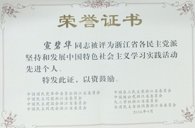 日前,浙江省各民主黨派堅(jiān)持和發(fā)展中國特色社會(huì)主義學(xué)習(xí)實(shí)踐活動(dòng)宣傳展示會(huì)在杭州召開。會(huì)議共表彰了22位浙江省各民主黨派堅(jiān)持和發(fā)展中國特色社會(huì)主義學(xué)習(xí)實(shí)踐活動(dòng)先進(jìn)個(gè)人,我集團(tuán)董事長宣碧華榮獲“浙江省民主黨派學(xué)習(xí)實(shí)踐活動(dòng)先進(jìn)個(gè)人”稱號(hào),成為浙江省民建3位先進(jìn)個(gè)人受到表彰。