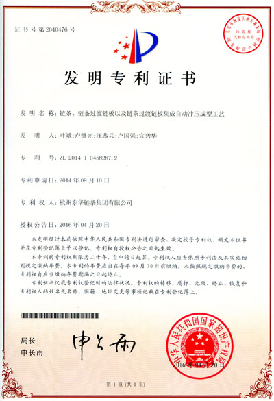 多年來,東華集團(tuán)以每天研發(fā)兩至三個(gè)新品種的研發(fā)能力一直成為中國(guó)鏈傳動(dòng)行業(yè)標(biāo)桿企業(yè)的標(biāo)志,尤其是每年獲得的專利都取得很好的社會(huì)效益和經(jīng)濟(jì)效益。如今年獲得的六件發(fā)明專利中:一種無聲鏈多顆落料光亮沖裁復(fù)合模,該發(fā)明實(shí)現(xiàn)了高速大批量生產(chǎn)表面及內(nèi)孔光亮的無聲鏈鏈板,避免了級(jí)進(jìn)模上采用擠光方式獲得光亮帶導(dǎo)致的原材料浪費(fèi),同時(shí)這種模具結(jié)構(gòu)對(duì)機(jī)床精度和送料機(jī)構(gòu)要求不高,降低了設(shè)備折舊成本;如鏈條、鏈條過渡鏈板以及鏈條過渡鏈板集成自動(dòng)沖壓成型工藝,本發(fā)明的目的在于克服現(xiàn)有技術(shù)中存在的不足,而提供一種鏈條、鏈條過渡鏈板以及鏈條過渡鏈板集成自動(dòng)沖壓成型工藝,通過把多個(gè)加工過程集成,用一臺(tái)沖制設(shè)備代替?zhèn)鹘y(tǒng)的沖制設(shè)備、退火設(shè)備和壓彎設(shè)備,提高效率,大大減少了加工設(shè)備和人工,降低了生產(chǎn)能耗,大大縮短了產(chǎn)品加工流程,顯著提高了過渡鏈板生產(chǎn)時(shí)的安全性。