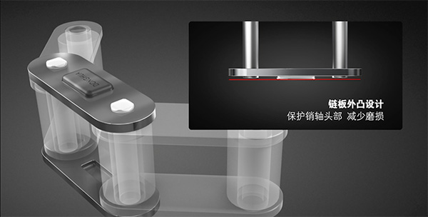1)鏈板外凸設(shè)計,保護(hù)銷軸頭部,減少磨損; | 2)銷軸表面硬化處理,提高使用壽命。 |