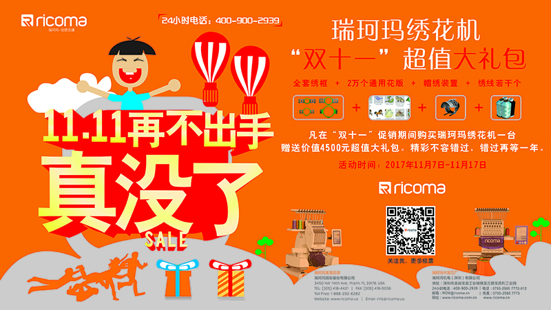 瑞珂瑪繡花機“雙11”超值大禮包,等您來拿,凡在“雙11”期間購買瑞珂瑪繡花機一臺,贈送價值4500元大禮包(全套繡框+2萬個通用花版+帽繡裝置+繡線若干個)。