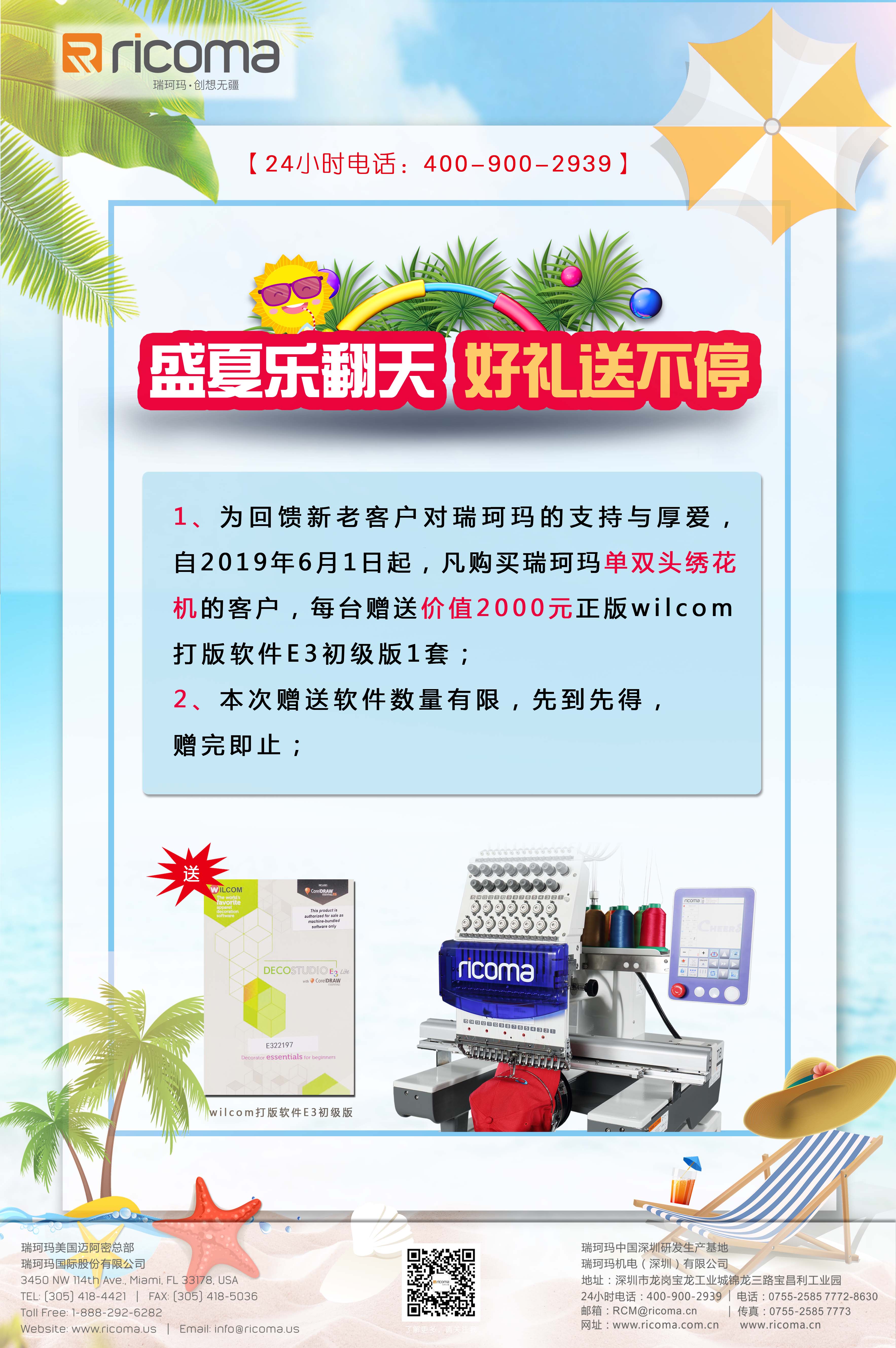 1、為回饋新老客戶對(duì)瑞珂瑪?shù)闹С峙c厚愛(ài),自2019年6月1日起,凡購(gòu)買瑞珂瑪單雙頭繡花機(jī)的客戶,每臺(tái)贈(zèng)送價(jià)值2000