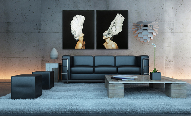 這是一種比較保守的布置方式,因為這樣,所以用這個方法不容易出錯,只需將兩幅裝飾畫左右或上下對稱懸掛。