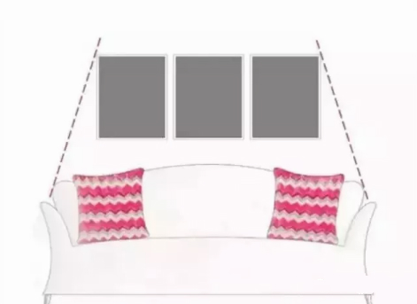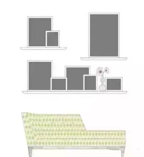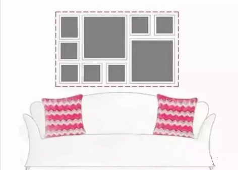 方框線掛法組合出來的裝飾墻,視覺上更加規(guī)整,首先需要根據(jù)墻面的情況,在腦中勾勒出一個方框,以此為界,在方框中加入組合式或者協(xié)調(diào)的裝飾畫。