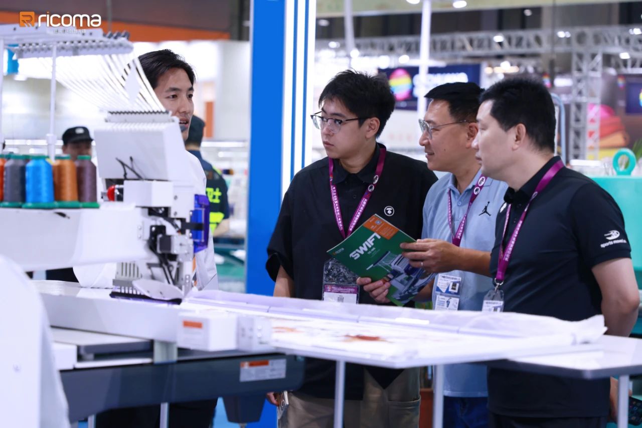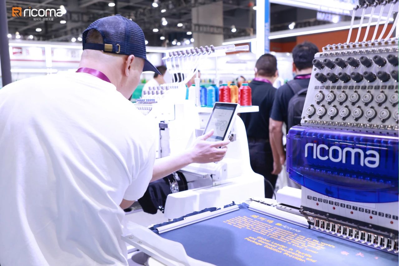 瑞珂瑪設備以高速度、高精度、智能化的技術優勢,在展位現場演示了大幅刺繡、成衣繡、裁片繡、成品帽繡和印花等多種應用場景的實現效果,吸引了大量到訪者、采購商的駐足參觀。